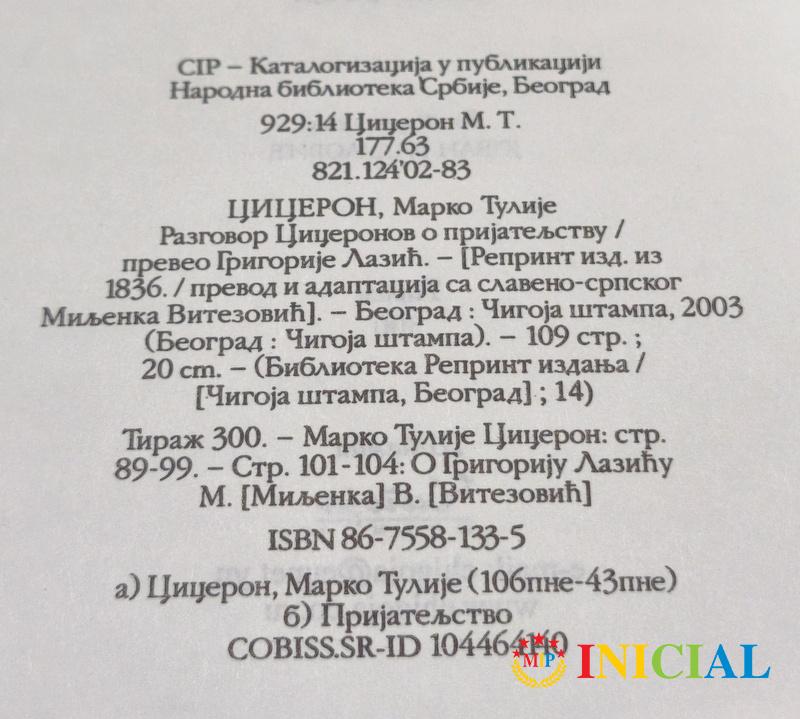 Razgovor Ciceronov o prijateljstvu,reprint izdanja iz 1836.god.