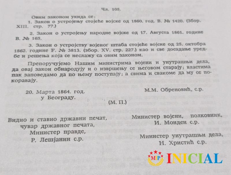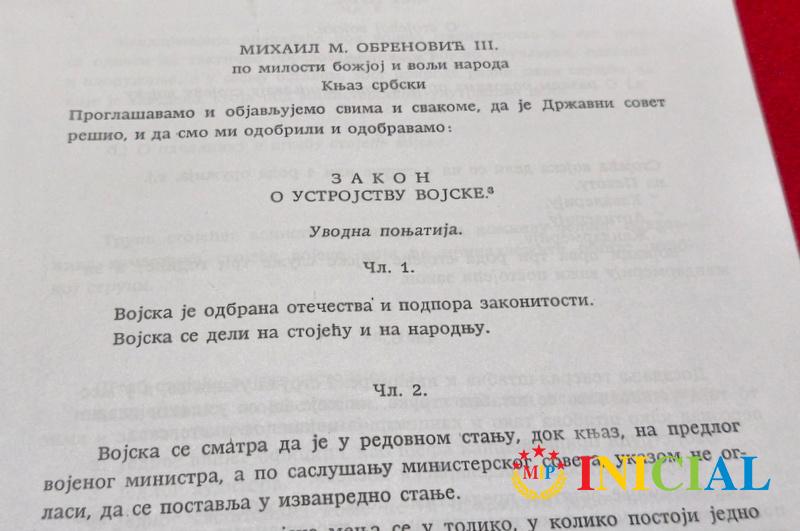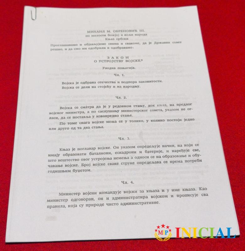 Zakon o ustrojstvu vojske,Knjaz Mihail M.Obrenovic III,Beograd,1864.god,str.28,fotokopija !