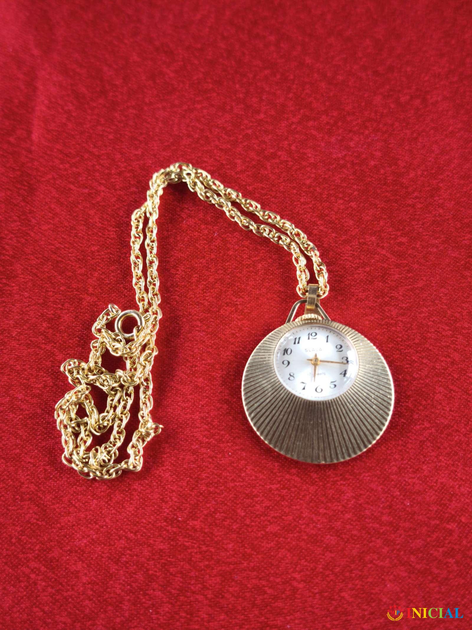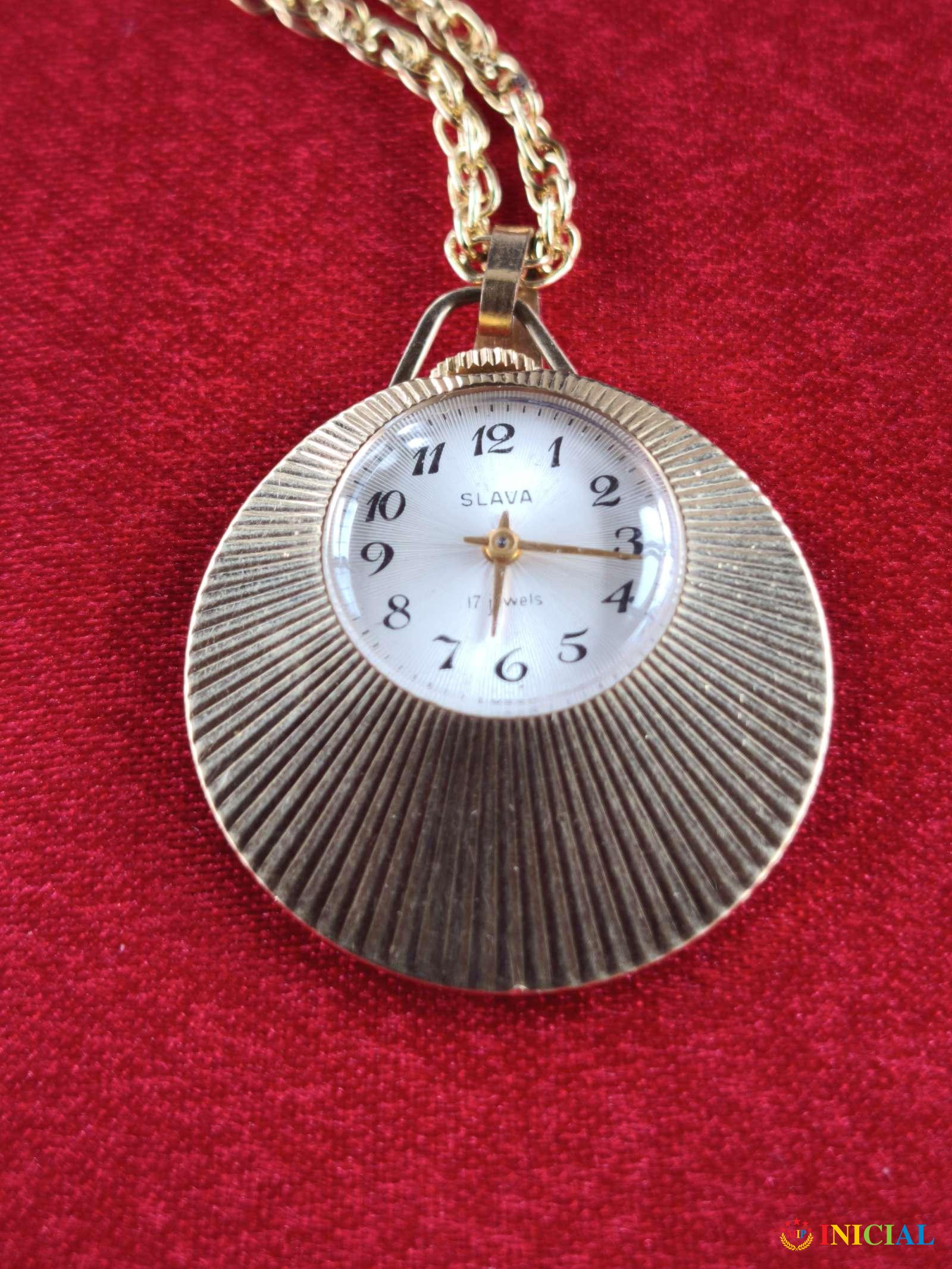 Pozlaćen zenski lancic sat Slava,17 Rubina,duz.lanca 42cm,prečnik brojčanika 30mm,made in USSR.