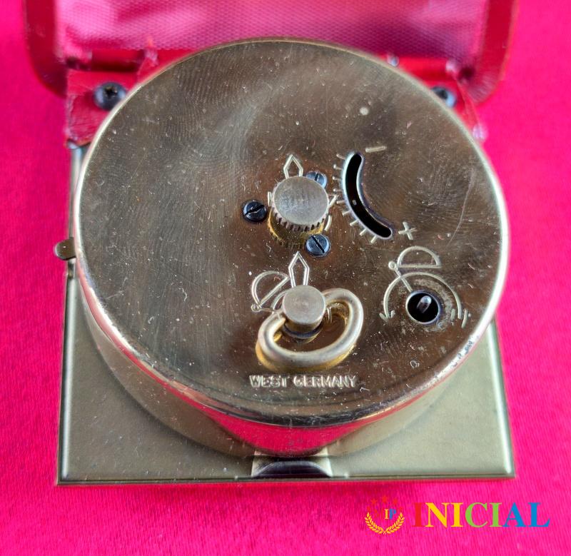 Putni sat u metalnoj kutijici,koji se automatski otvara,ima 4 kazaljke,dim.6,5 x 6,5 x 2,5cm.