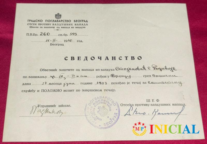 Svedocanstvo sanitetske sluzbe,Beograd,1940.god.