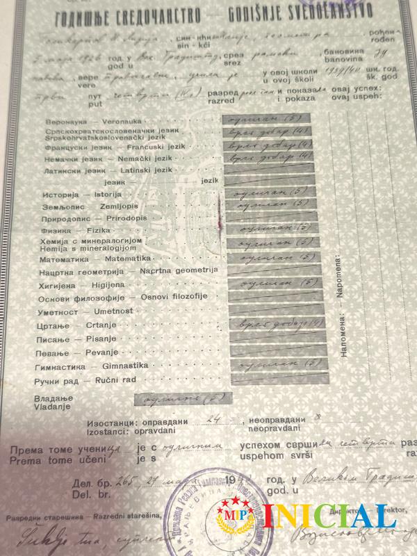 Godisnje svedocanstvo o zavrsenom IV razredu,Kraljevina Jugoslavija,Veliko Gradiste,1940.god.