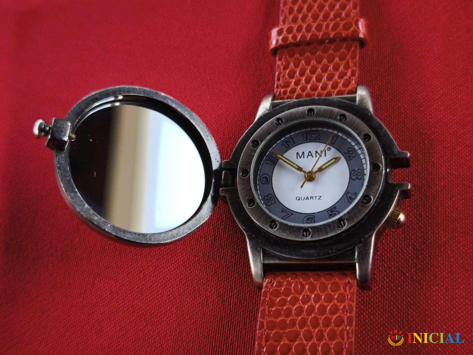 Decji kvarcni sat Mani,sa poklopcem na kome je ogledalce,koznim kaisem (nov).